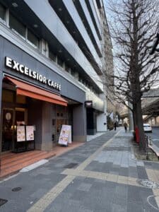 - 出口を出て、正面方向(西方向)に進みます。左手にEXCESIOR CAFEを見ながら、まっすぐに進みます。